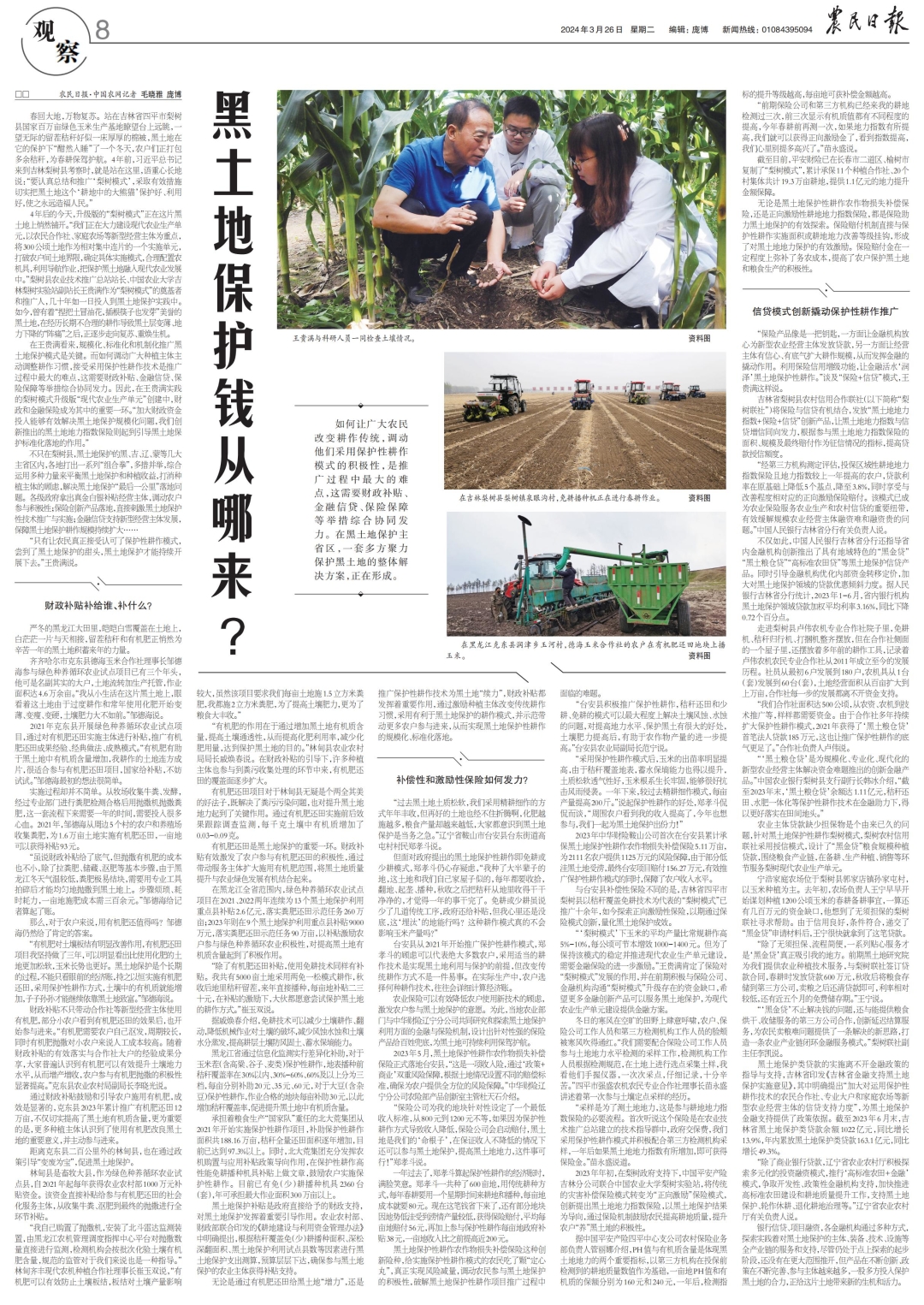 不只在梨樹縣,黑土地保護的黑、吉、遼、蒙等幾大主省區(qū)內(nèi),各地打出一系列“組合拳”,多措并舉,綜合運用多種力量來平衡黑土地保護和種植收益,打消種植主體的顧慮,解決黑土地保護“最后一公里”落地問題。各級政府拿出真金白銀補貼經(jīng)營主體,調(diào)動農(nóng)戶參與積極性;保險創(chuàng)新產(chǎn)品落地,直接刺激黑土地保護性技術(shù)推廣與實施;金融信貸支持新型經(jīng)營主體發(fā)展,保障黑土地保護耕作規(guī)模持續(xù)擴大……